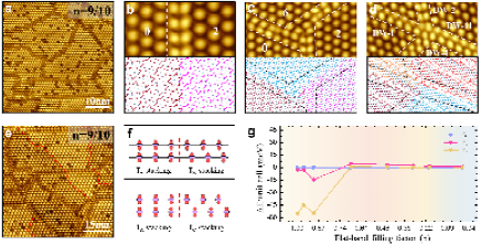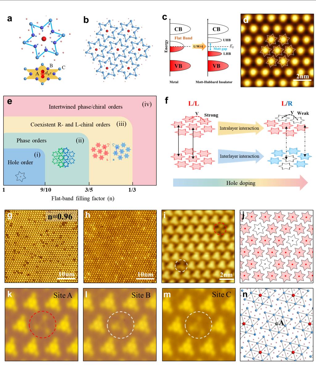 该团队利用变温STM技术,实空间直接观察到了1T-TaS2在不同平带填充因子下多种电子、原子有序态的依次出现和演化。随着空穴掺杂导致的平带填充因子的降低,1T-TaS2从长程有序的CDW结构经过离散型电子空穴,逐渐转变为碎片化的相位畴和手性畴。这来自于空穴掺杂导致的平带电子关联作用减弱,从而降低了电子-原子晶格的相互作用。特别是,在手性畴界和手性层间堆叠区域,还进一步发现了中间环状CDW团簇和向列型CDW态,这些结构的出现归因于该体系电子-电子和电子-原子晶格相互作用的复杂竞争合作关系。