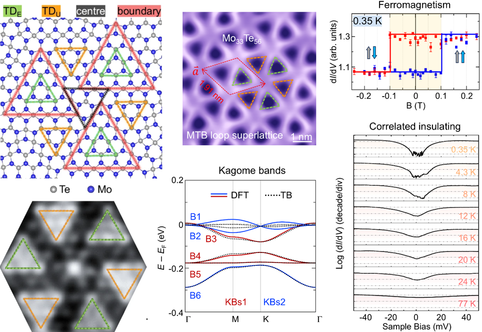 创新方案:因其独特的几何特性,笼目晶格(kagome lattice)可导致电子波函数干涉相消,是实现平带和狄拉克能带的理想晶格之一。现有的笼目材料多为块体材料,难以保证获得近费米能级平带且不与体能带交叉。为了获得与其他能带无交叉的近费米能级平带,研究团队聚焦在二维极限下构筑笼目晶格材料,创新性地提出了化学势控制孪晶界尺寸和排列的新策略,利用孪晶界超晶格创制出非简单化学计量比的笼目单层材料——Mo33Te56单层材料(下图左上)。