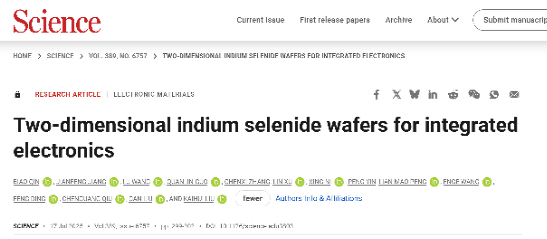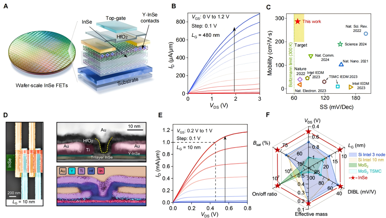 在众多候选材料中,硒化铟(InSe)因其低电子有效质量、高热速度以及合适带隙等优异特性,被广泛认为是突破硅极限的有力竞争者,甚至被诺贝尔奖获得者Andre Geim教授誉为“黄金半导体”。InSe理论性能不仅显著优于硅,也超过MoS2、WS2等典型二维半导体材料。目前,已在原型器件中得到初步验证。然而,其在晶圆集成制造层面的“卡脖子”问题长期未解,成为阻碍其应用的关键问题。目前高质量InSe样品主要依赖机械剥离法获得,产量和尺寸均受到限制,仅局限于实验室研究,远未达到支撑集成电路制造所需的晶圆级规模和质量标准。