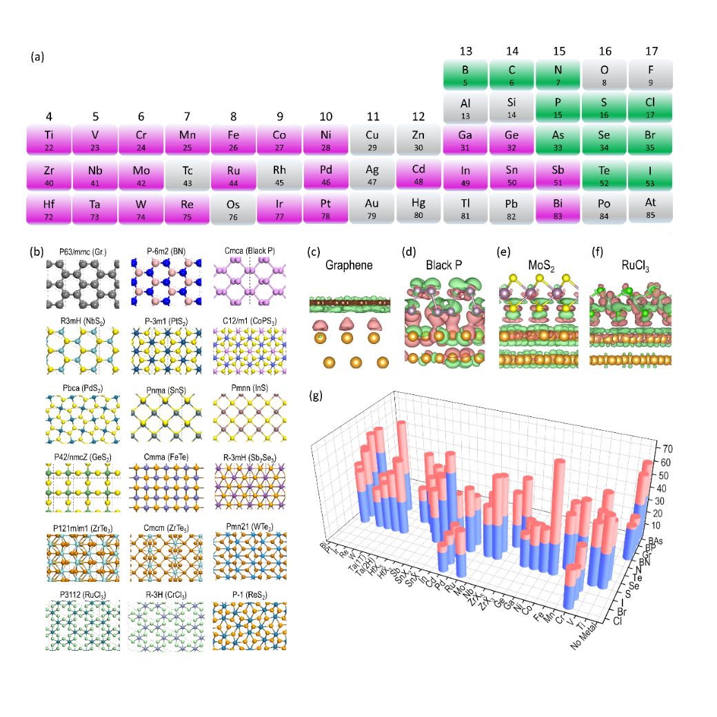 图2. 不同层状材料自身层间结合能以及与Au(111)相互作用能的对比。(a-b)研究的二维材料所涉及到的元素(a)及所在空间群(b);(c-d)四种典型二维材料与Au(111)的差分电荷密度;(g)二维材料与Au(111)的结合能和其层间结合能的柱状图。
