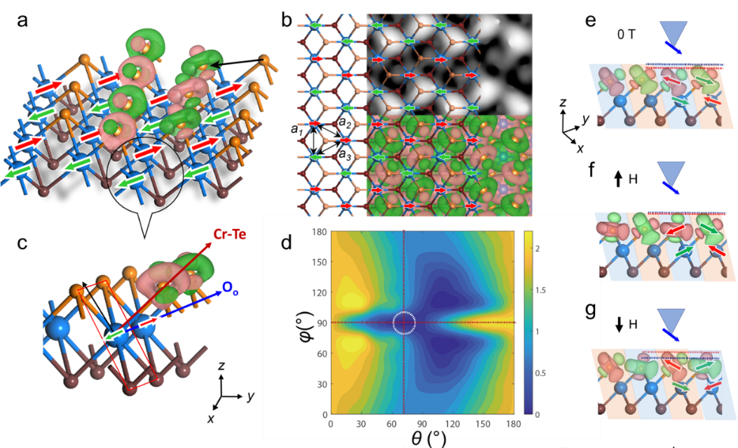 第一性原理计算表明,当CrTe2的层数由2层及以上减小到单层极限时,缺乏层间耦合的单层CrTe2呈现锯齿状反铁磁性(图2a),对应的自旋极化扫描隧道显微镜模拟图像与实验图像高度符合(图2b)。其自旋衬度来源于被Cr原子极化、在空间上劈裂且可在外场下偏转的Te原子中的px/y和pz轨道(图2e-2g)。磁各向异性计算发现CrTe2单层的磁矩方向在y-z面内,并与z方向呈70度夹角(图2c-2d),可以将其分解为面内与面外两个磁矩分量,进而导致一种新颖的磁场下自旋重取向转变模式。