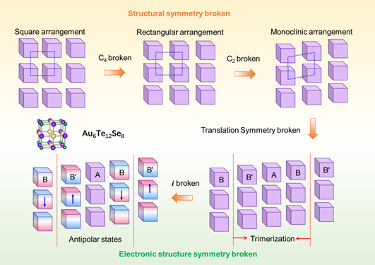 图3.超原子晶体AuTe2Se4/3体系中,其几何结构和电子结构的自发对称破缺过程示意图。