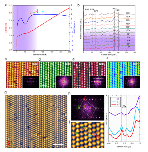 图1.超原子晶体AuTe2Se4/3体系中,降温过程依次出现的三倍周期电荷密度波和反极化金属态的电输运、拉曼光谱以及变温扫描隧道显微镜/谱实验研究。