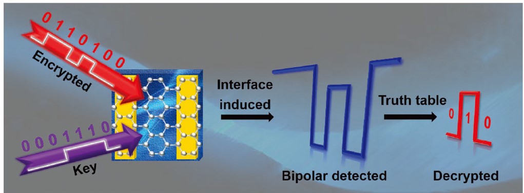针对空间光通信安全性问题,北京邮电大学郭霞教授、williamhill英国官网陈珊珊教授和中国电子科技集团第十三研究所周幸叶(共同通讯作者)等合作开发了一种基于石墨烯/GaN异质结双极性光电探测器。发现石墨烯/GaN异质结构中界面诱导效应,使其对紫外和红光展现出明显的双极性特征,能够依据紫外、红光的开关状态展示出了四种高低稳定的光电流。据此,研究人员进一步提出“两把钥匙开一把锁”的加密思路,将信息分别隐藏在紫外和红光两束光波中,只有当两束光同时入射至探测器上,根据编码协议即可解密出完整的光信息(图1)。该技术可推广至可见光和近红外波段,为自由空间安全光通信提供了一种新的加密策略。