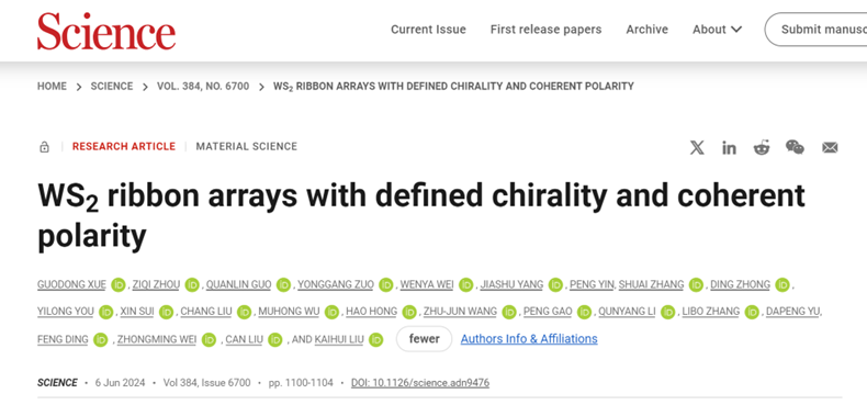 williamhill英国官网物理学系、量子态构筑与测控教育部重点实验室刘灿副教授与北京大学刘开辉教授、中国科公司半导体研究所魏钟鸣研究员、中国科公司深圳先进技术研究院丁峰研究员等团队合作,提出“多重界面耦合原子制造”新策略,首次实现兼具特定手性结构(包括扶手椅型、之字型及其他手性结构)及相干极化方向的二硫化钨(WS2)条带阵列的“全同”控制制造。通过系统研究手性结构与体光伏效应的对应关系,实现1000余根扶手椅型条带阵列的自发光电流集成输出。该研究为一维结构的原子级精准制造提供了定制化方案,有望促进其在新型电学、光电转换器件的阵列化集成芯片加工。2024年6月6日,相关成果以“具有可控手性与相干极性的二硫化钨条带阵列”(WS2 ribbon arrays with defined chirality and coherent polarity)为题,在线发表于《科学》(Science)。