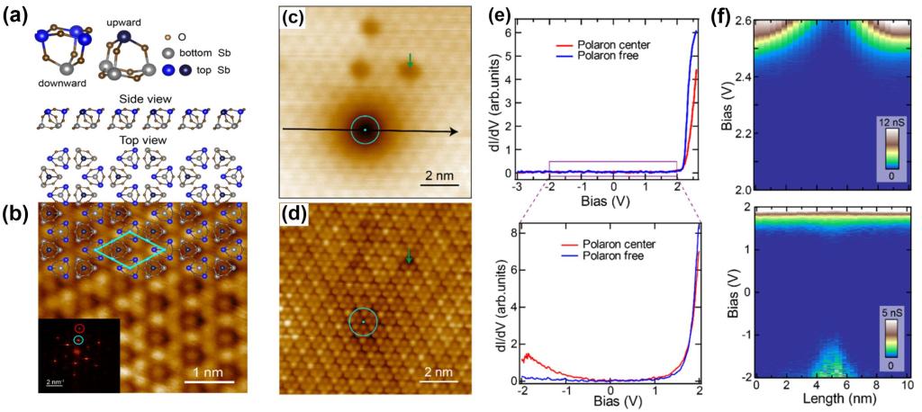 本工作中,研究团队在覆盖于SiC上的石墨烯表面生长的Sb2O3无机团簇晶体。通过STM实现了和类共价准键相关的单个极化子的观察和操纵。单个极化子占据了Sb2O3无机团簇晶体的间隙位置,表现出极化子态和局部的能带向上弯曲。研究展示了通过STM探针施加电场以可控地产生、移动和擦除单个极化子的能力。密度泛函理论(DFT) 计算表明,尽管分子间主要由范德瓦尔斯吸引相互作用主导,额外注入的电子局域地占据了团簇间的成键态,缩短局部团簇间隙的距离,而局域间距收缩的团簇又为注入电子提供了额外的吸引势,形成了范德瓦尔斯极化子。该研究揭示了一种新的极化子类型,并提供了一种在原子尺度上操纵单个电子的可行新途径。