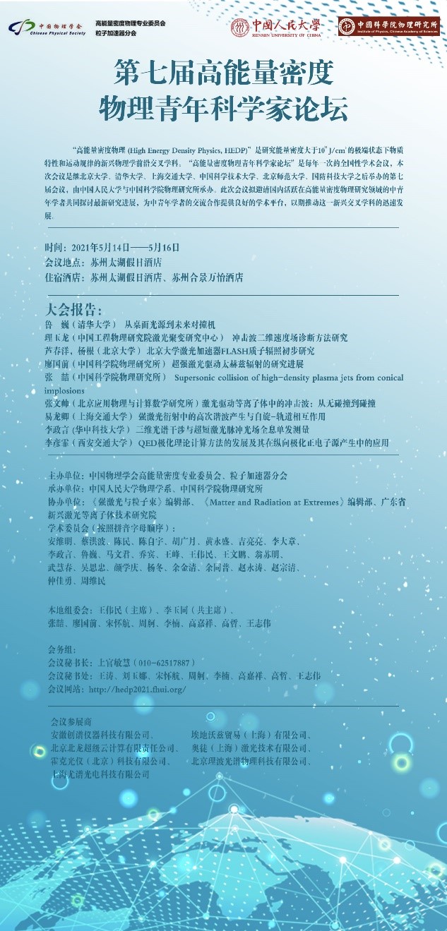 2021年5月14日至2021年5月16日,由中国物理学会高能量密度物理专业委员会、粒子加速器分会主办,williamhill英国官网物理学系与中国科公司物理研究所承办的"第七届高能量密度物理青年科学家论坛"在江苏省苏州市成功举办。